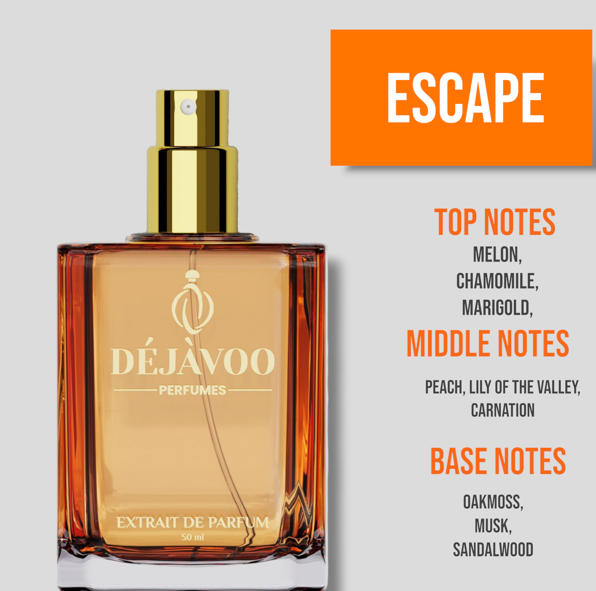 Dejavoo's inspired version of CK Escape is a fresh, floral fragrance that is perfect for everyday wear. The fragrance features top notes of apple, mandarin and peach, middle notes of rose and lily-of-the-valley, and base notes of sandalwood, vetiver and musk.