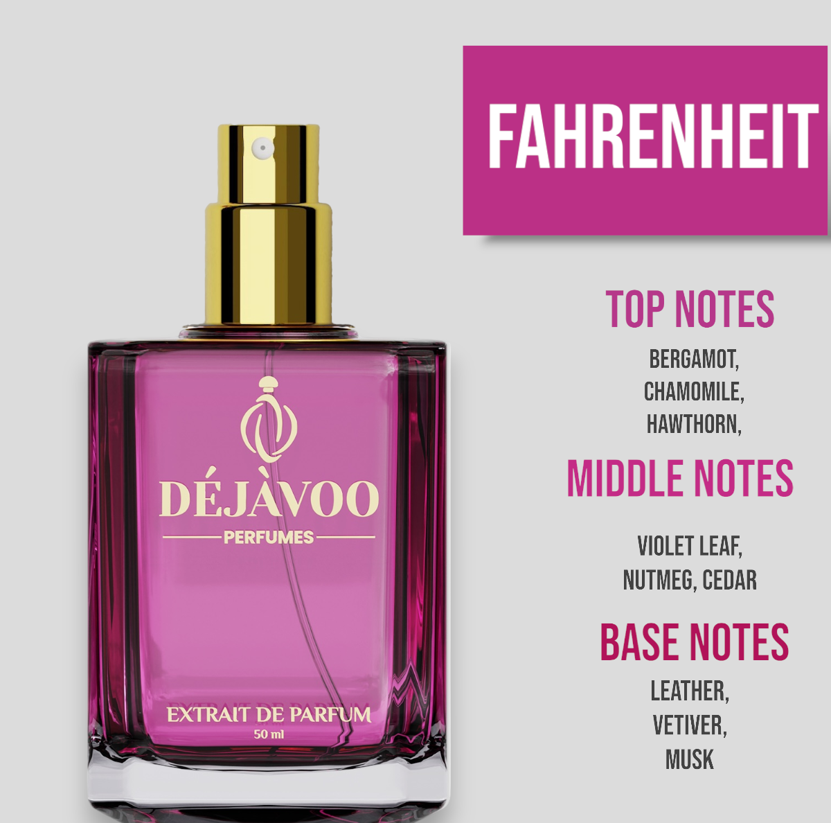 Dejavoo's inspired version of Dior Fahrenheit is a woody, floral fragrance that is perfect for a night out. The fragrance features top notes of mandarin and bergamot, middle notes of violet and leather, and base notes of vetiver and patchouli.