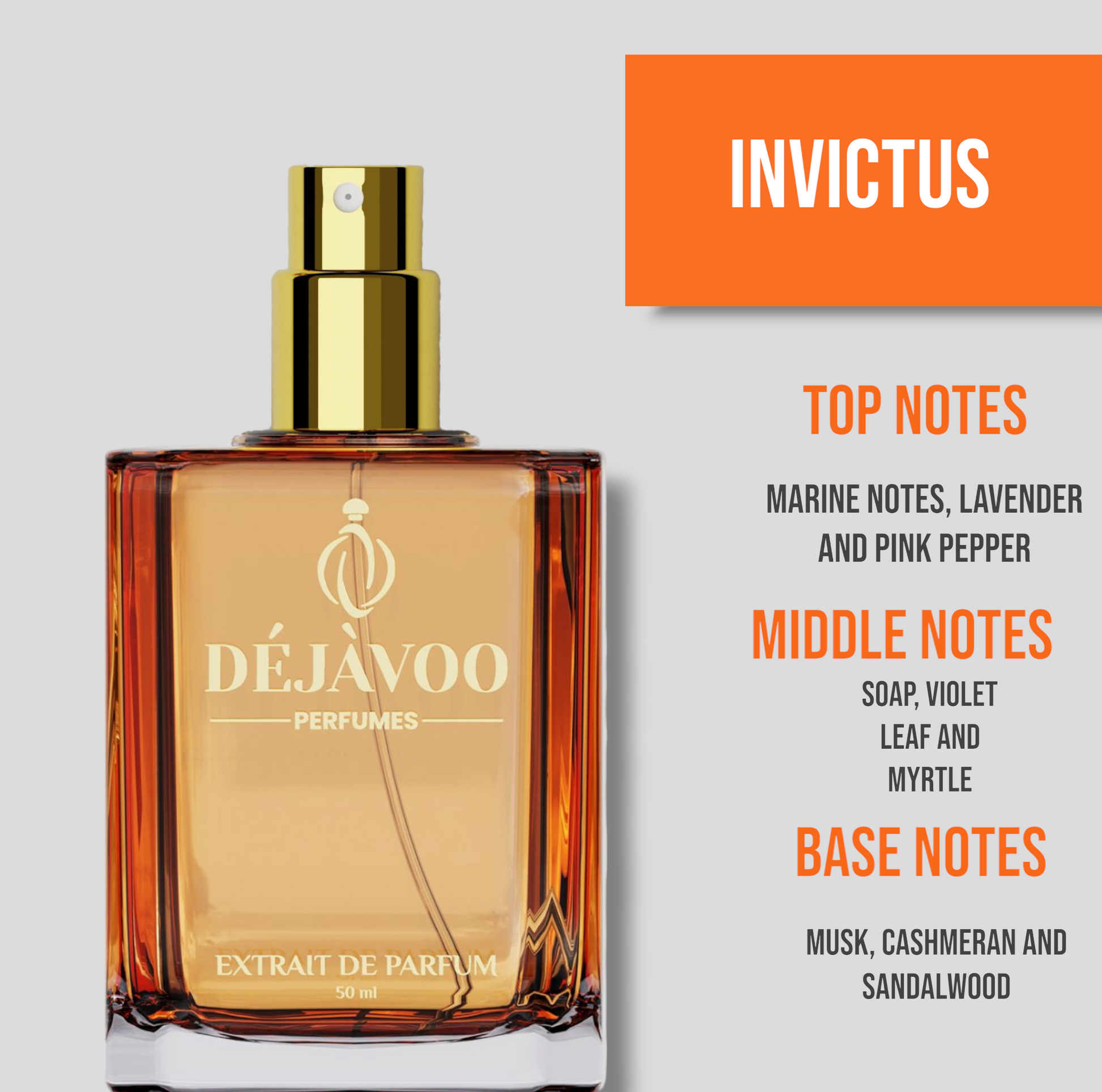 Dejavoo's inspired version of Paco Rabanne Invictus is a fresh and sporty fragrance that is perfect for daytime wear. The fragrance features top notes of grapefruit, mandarin orange, and marine accord, middle notes of bay leaf and jasmine, and base notes of guaiac wood, oakmoss, patchouli, and ambergris