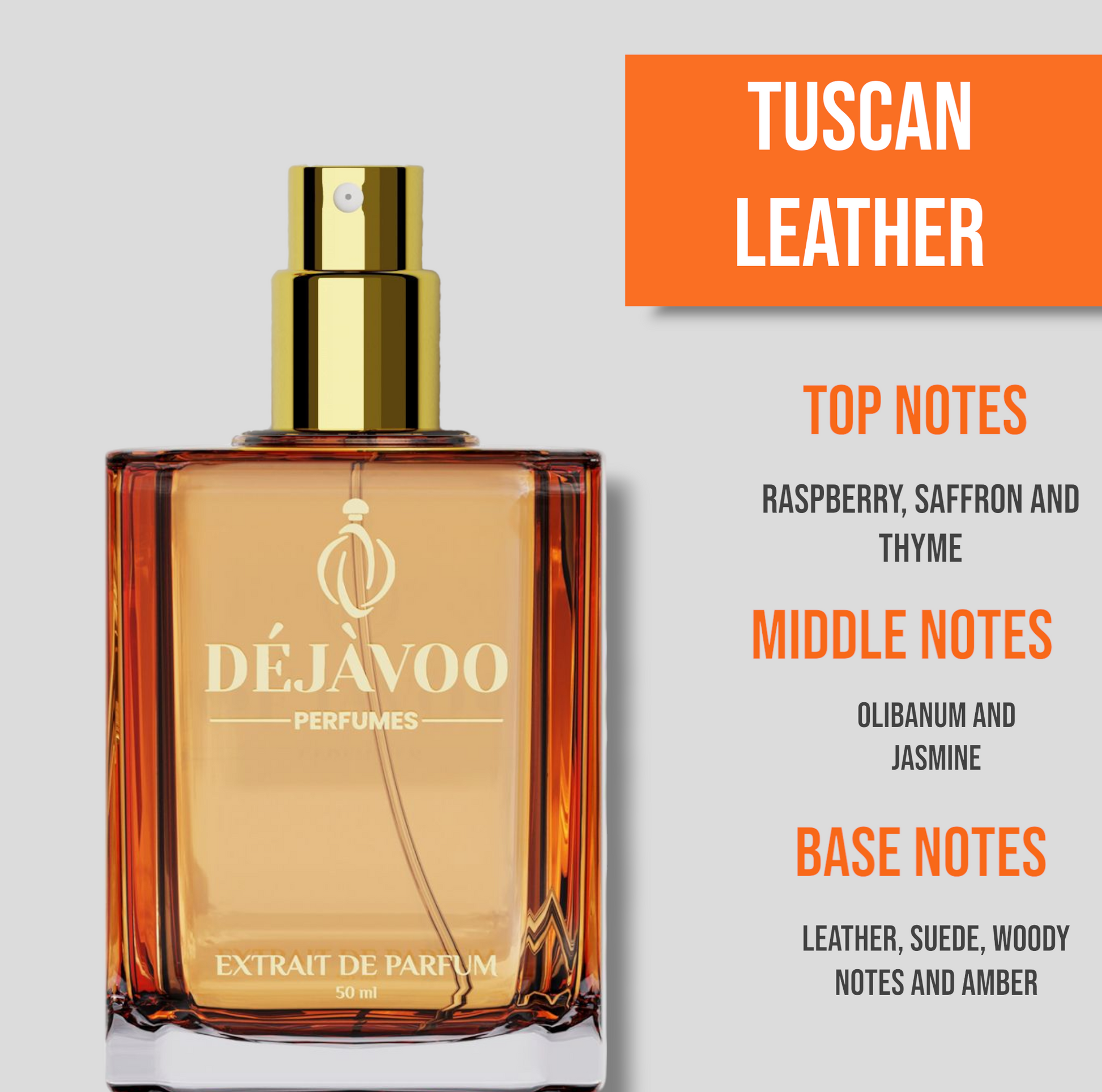 We have an inspired fragrance that is similar to Tom Ford Tuscan Leather. Our fragrance features top notes of saffron, raspberry, and thyme, middle notes of jasmine and olibanum, and base notes of leather, suede, and amber. Our fragrance is long-lasting and affordable.